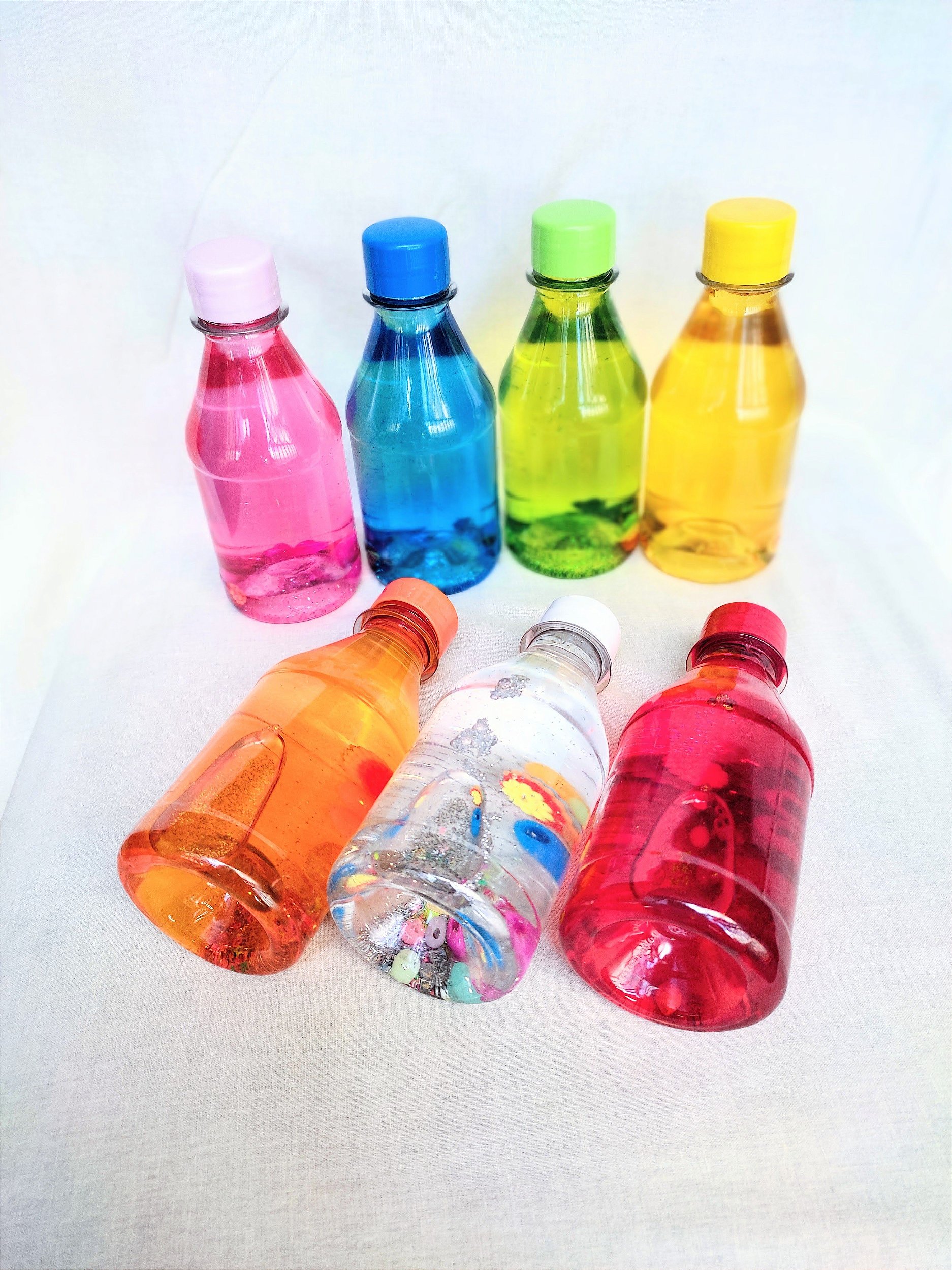 A garrafa da calma trabalha na estimulação sensorial e cognitiva da criança. Ao movimentar a garrafa, as partículas brilhantes se misturam ao liquido, atraindo a atenção das crianças, causando um efeito calmante.