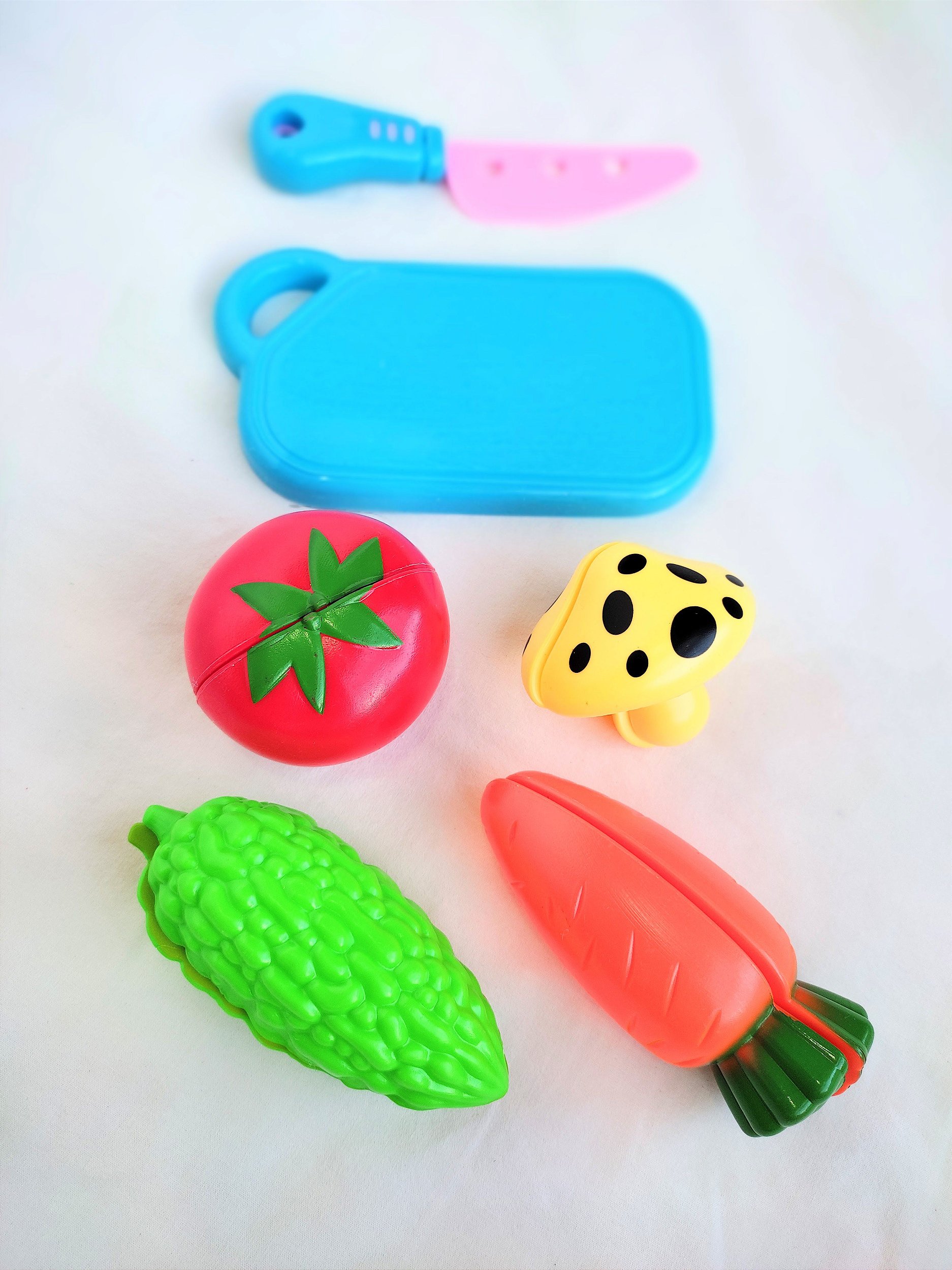 O Kit frutas/ vegetais com corte em velcro contém 4 frutinhas/ legumes em plástico antialérgico e coloridos medindo aproximadamente entre 2 cm a 3 cm, 1 tábua de cortar e 1 faquinha plástica.